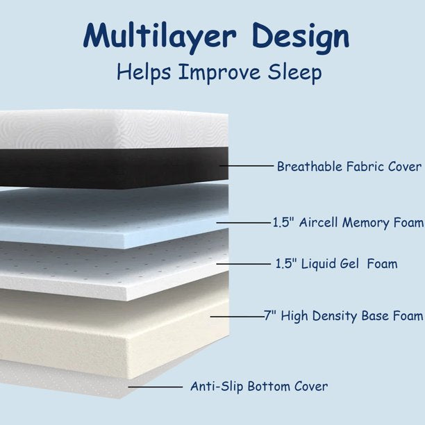 【Pressure relief】The top of this memory foam mattress is a 1.5 Aircell Memory Foam which adapts to your unique body shape and promotes proper the spine is aligned helping prevent aches and pains. 【Support the body】This 10 inch mattress is constructed with a 3-layer foam system each layer is designed to provide comfort and support all night long. The 7 inch high-density foam layer will enhance mattress stability and support. 【Good Breathability】The memory foam on the top of the mattress Aircell cooling technology and Liquid Gel Foam increase the breathability and cooling of the mattress. And the soft comfort knit cover allows you to feel comfort and breathability.