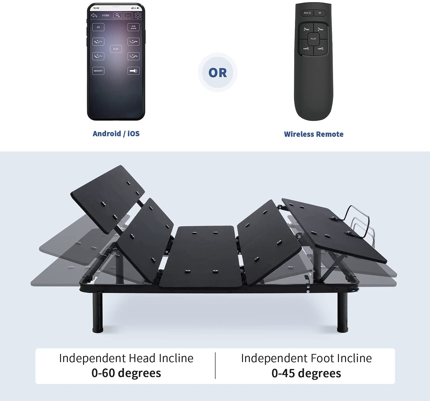 Smart Wireless Remote Control - Control the adjustment of the electric bed without getting out of bed! Just connect it to your smartphone or tablet via Bluetooth and download the App. Or if you feel a bit more conservative there is also a handy wireless remote for adjustable bed that will offer you a set of buttons with images for its easy operation. Save your time choosing one-touch flat zero gravity or memory button when adjusting this electric bed frame.