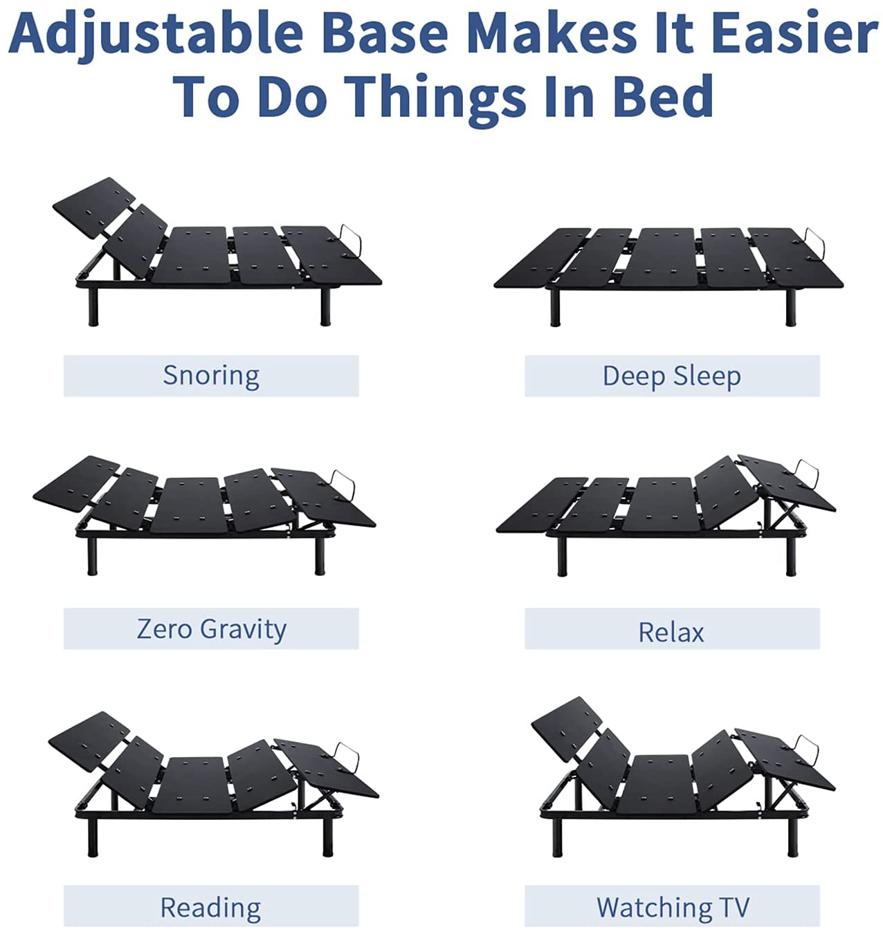 Ergonomic Adjustable Bed Frame - Improve the quality of the very important 1/3 part of your life - your sleep. Once having success in finding your most comfortable sleeping position in this adjustable bed base you will feel like back muscles are getting a long-awaited pain relief the enhanced airflow helps you to deal with annoying snoring problems and boosts your digestion. The pregnancy discomfort also can be alleviated by the convenient customizing positions function.