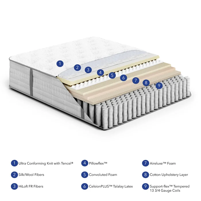 Latex helps the body maintain a consistent body temperature throughout the night while experiencing the comfort pressure relief breathability and health benefits of natural Talalay latex The top panel covered in ultra conforming knit with Tencel for a cushioned surface a smooth touch and skin-sensitive feel over 49 hand outer tufts for enhanced durability and a unique luxurious look. Support-flex tempered 13.75 gauge individually wrapped coils that perfectly contours to your body without distributing the movement throughout the mattress. The mattress brings together innovative design with the next generation of materials to guarantee you the best sleeping experience. Built on the patented lift the item allows the natural sleep chamber between the springs and the mattress top to breathe and perform at its best. When the springs meet the layers of luxury materials the bed completely synchronizes with your body. It can only be described as a lift. Where other mattresses stay flat or sink in only this product has the patented lift.