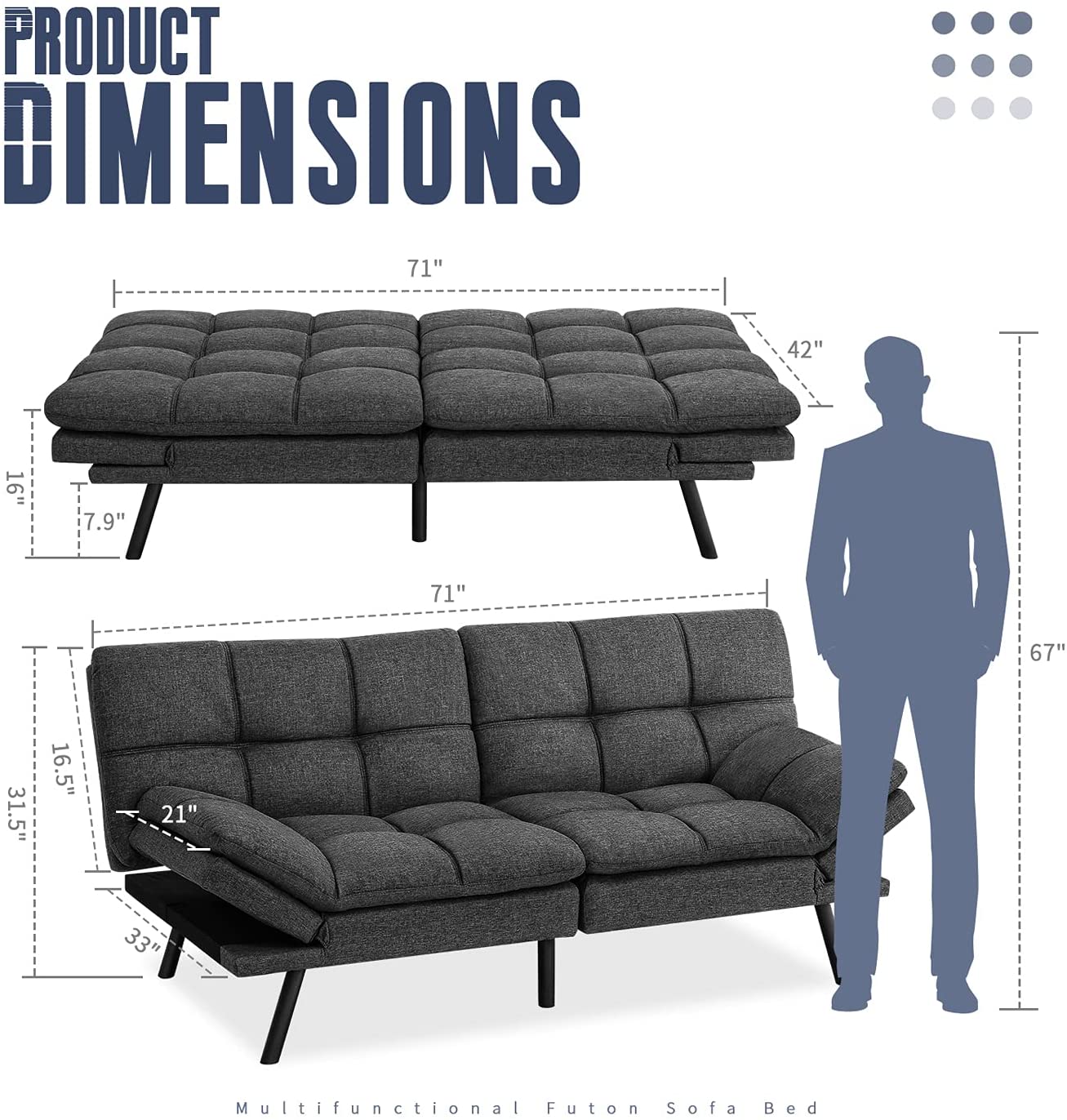 Ideal for Small Space - The convertible and compact design of the futon makes it ideal for studios apartments dormitories guest rooms offices game rooms and living rooms. Futon sofa dimensions: 71 L x 33 W x 31.5 H; Sleeper bed dimensions: 71 L x 42 W x 16 H; Weight Capacity: 600 lbs.