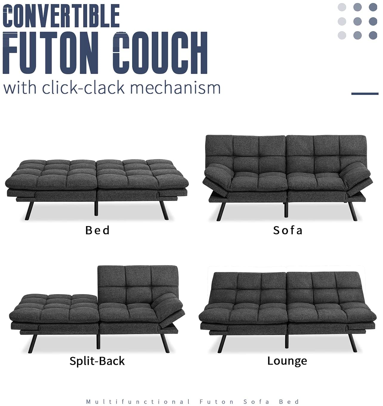 Convertible Sofa Bed - Thanks to the click-clack mechanism you can set the futon sofa in three positions: upright slightly reclined and flat using it as a couch lounger or sleeper bed. Futon also has a split back that allows one side to recline while the other side remains upright.